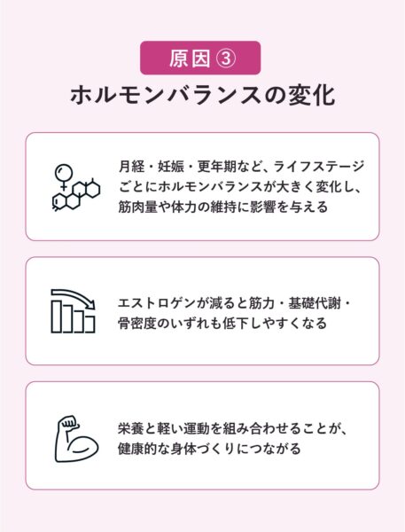 女性は月経・妊娠・更年期など、ライフステージごとにホルモンバランスが大きく変化し、それが筋肉量や体力の維持に影響を与える。とくに更年期以降は、女性ホルモン(エストロゲン)の分泌が急激に減少し、筋肉や骨、細胞を保つ働きが弱まる。