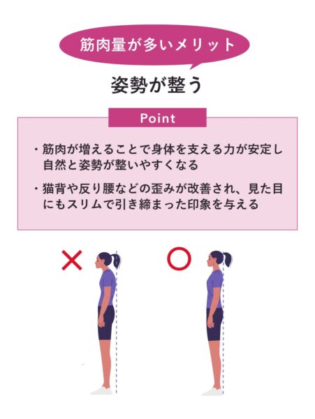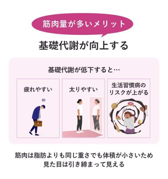 実は、筋肉量を増やすことは、身体を大きくすることではなく、健康的に「引き締める」ための近道。基礎代謝の向上や冷え・むくみの改善など、見た目にも内側にも嬉しい変化が現れる。