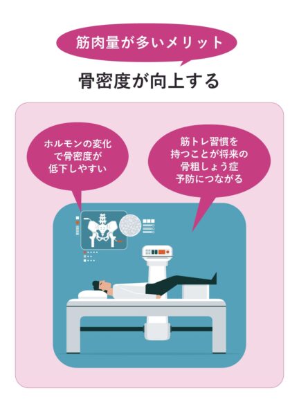 エストロゲンは、筋肉の合成を助け、骨密度を維持し、代謝を高める重要な役割を担うため、このホルモンが減ると筋力・基礎代謝・骨密度のいずれも低下しやすくなる。この時期は、ホルモン変化を止めることはできなくても、筋肉を守る生活習慣を意識することで代謝や体力の低下を防げる。