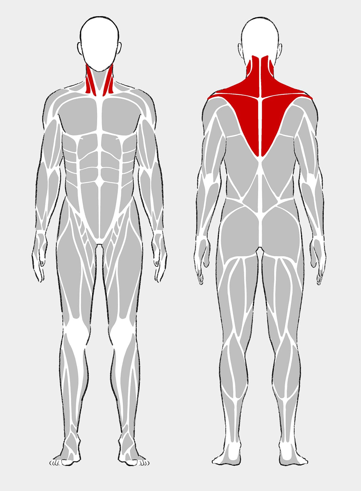 | 位置 | 首の後ろから肩、背中に広がる大きな筋肉 |
