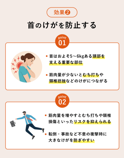 首まわりを鍛えて筋肉量を増やすと、その衝撃を吸収・分散でき、むち打ちや頸椎損傷といったけがのリスクを抑えられる。