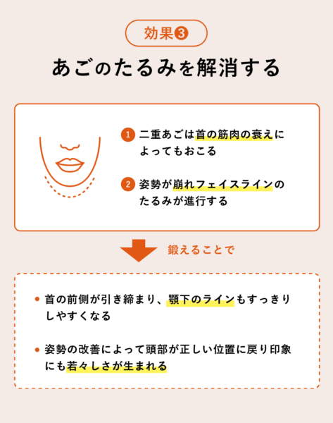 顎下のたるみ、いわゆる二重あごは、脂肪の蓄積だけでなく首の前面にある胸鎖乳突筋や舌筋群の衰えによっても起こりやすい。首の筋肉が弱まると頭が前に出て姿勢が崩れ、フェイスラインのたるみが進行する。