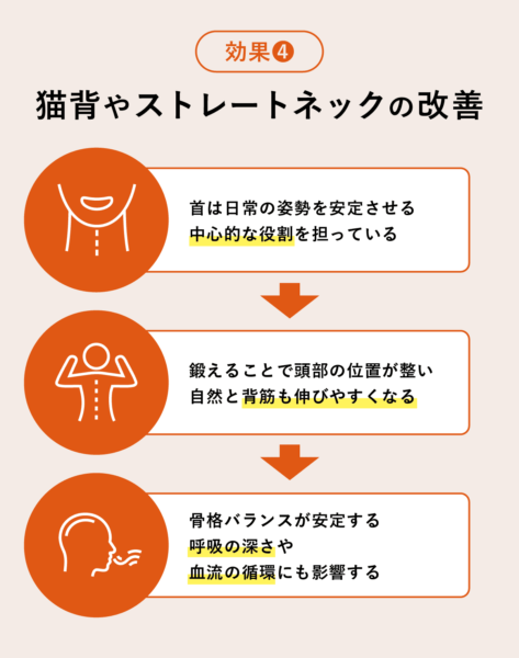 首の筋肉を鍛えることで頭部の位置が整い、自然と背筋も伸びやすくなる。正しい姿勢が定着すれば、骨格バランスが安定し、筋肉や関節への余分な負荷が減少するだけでなく、呼吸の深さや血流の循環にも影響する。