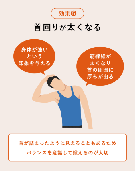 首の筋肉(僧帽筋や胸鎖乳突筋など)を継続的に鍛えると、筋繊維が太くなり、首の周囲に厚みが出る。これは筋肉の肥大によるもので、スポーツ選手のように力強い体格を目指す場合にプラスとなる。