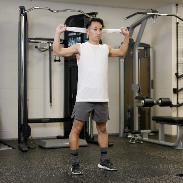 - タオルを頭の後ろにかけて両手でタオルの両端を持つ