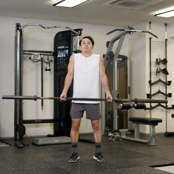 常に背すじを伸ばしたまま、股関節を軸に身体を上下することを意識しましょう。バーがひざを越えてから上体を起こすようにすると、実施しやすくなります。