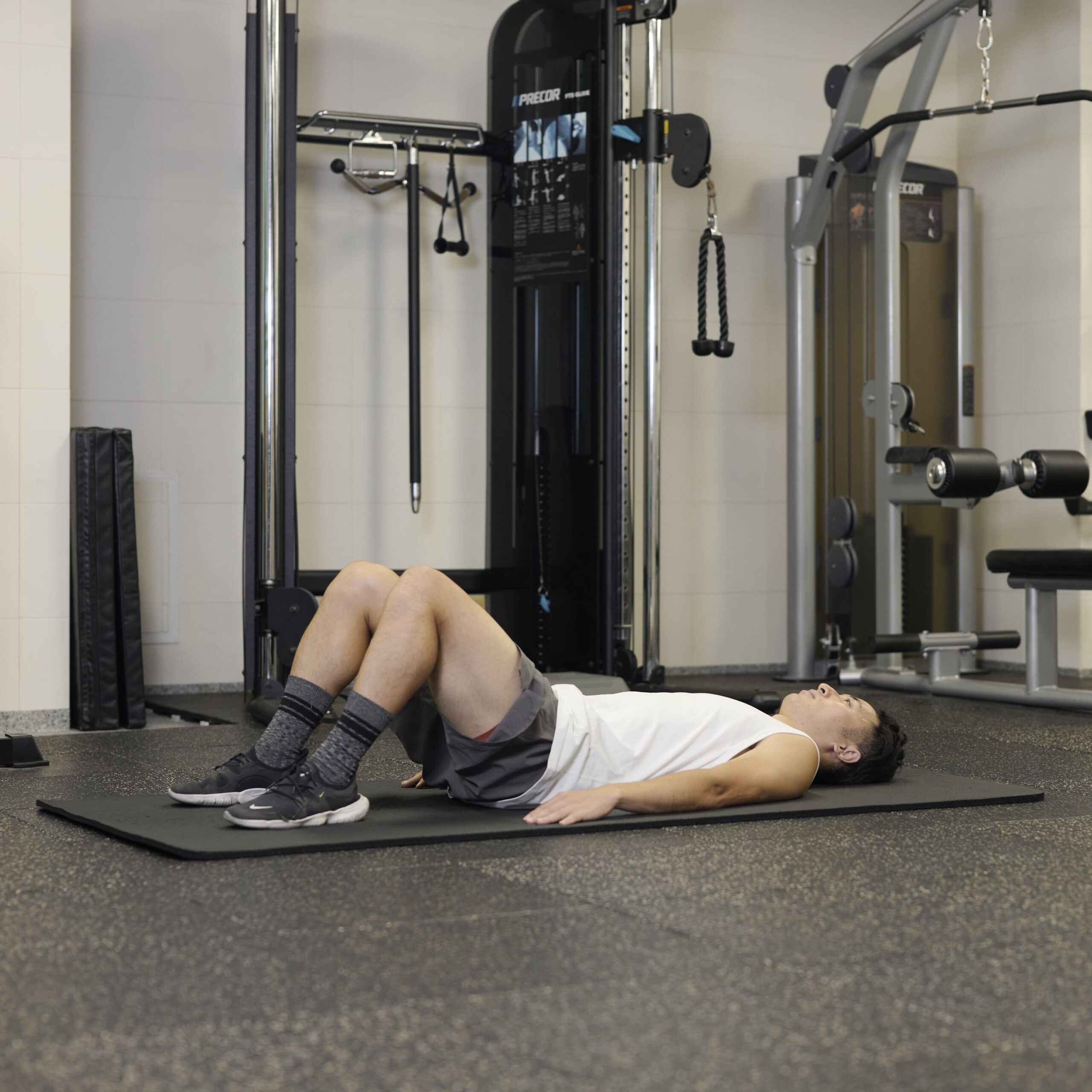 - ひざを曲げて足を床につけ、バーベルを骨盤の上に置く