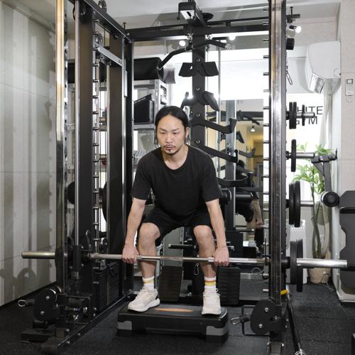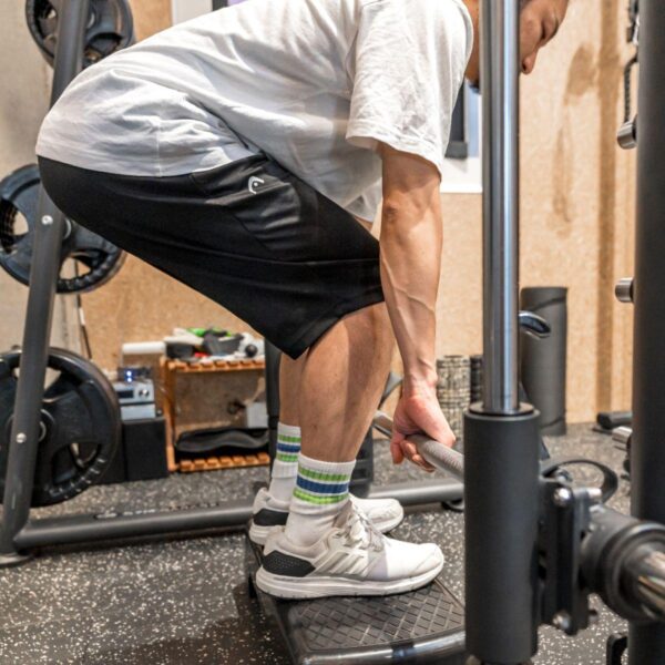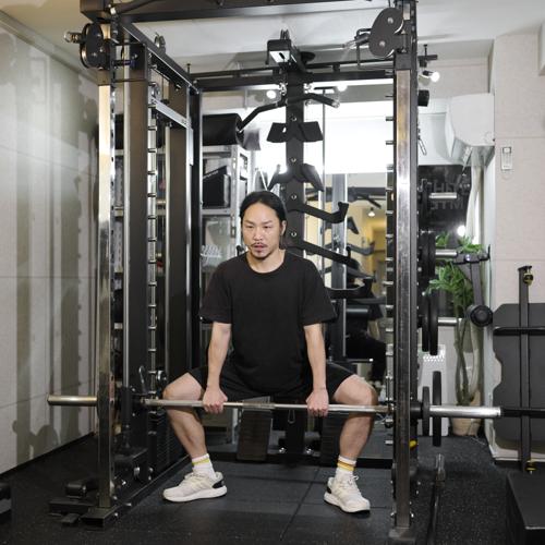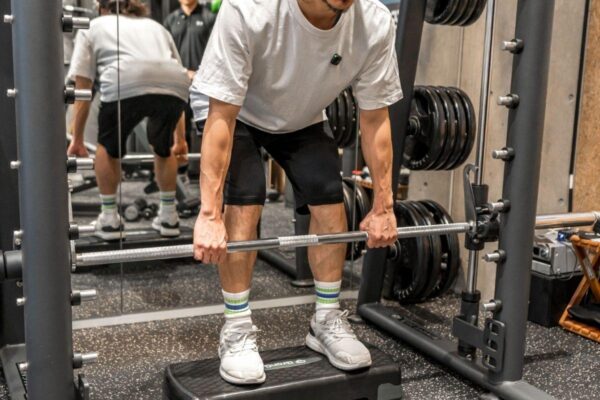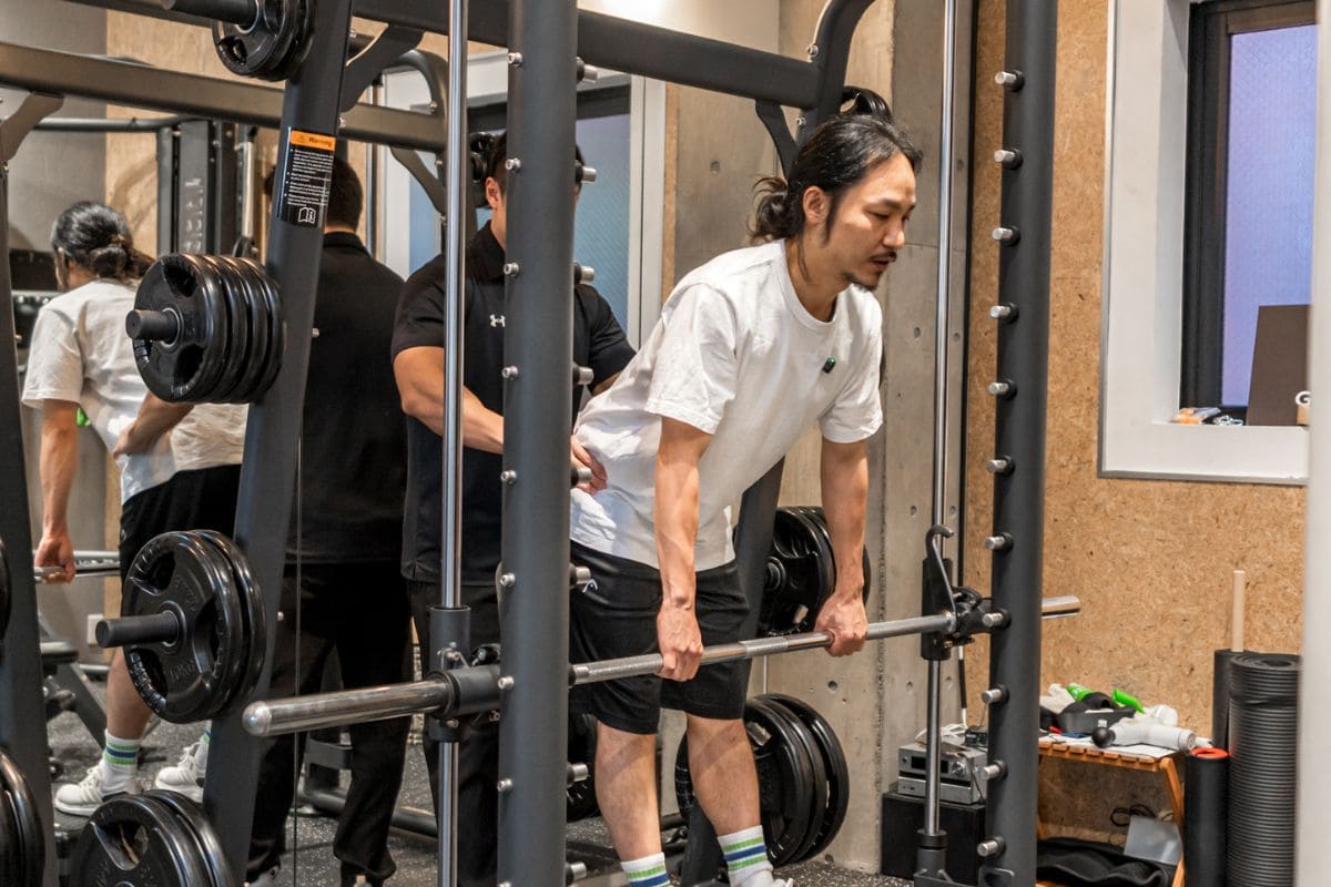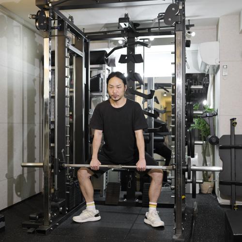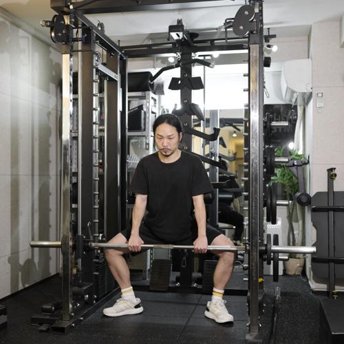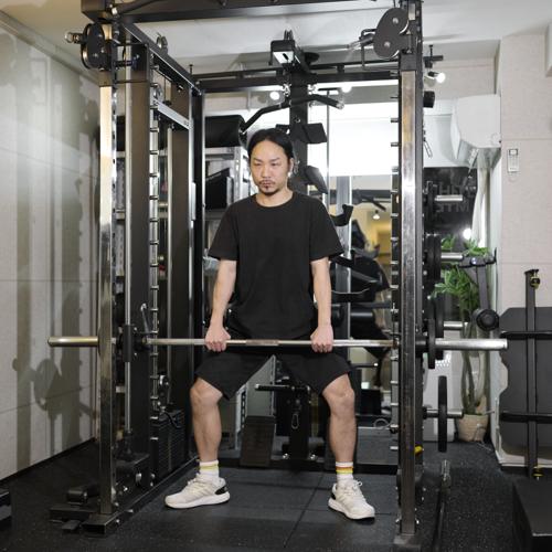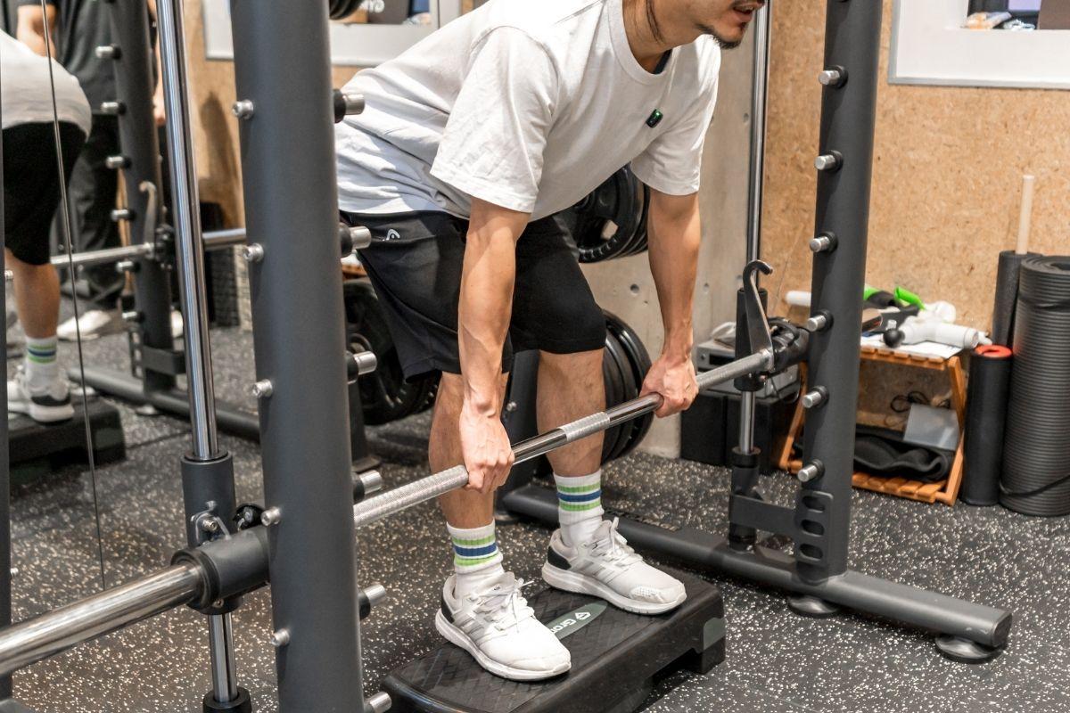 スモウデッドリフトはワイドスタンスで構えるため、内転筋やお尻を使う感覚が強く感じられました。スミスマシンを使う場合は軌道が安定しているため、足幅やつま先の向きといった下半身のセットアップに集中できました。