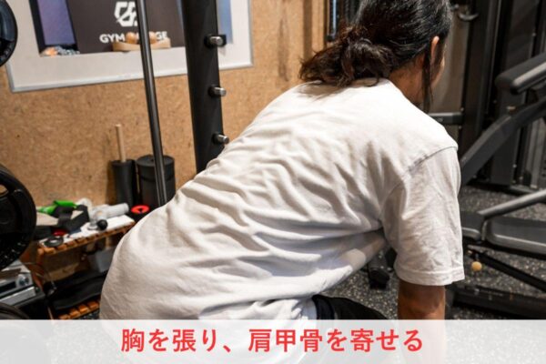 バーを握る前から肩甲骨を軽く下げて後ろへ寄せると、背中全体で重量を受け止めるフォームになりやすい。腕だけで引こうとせず、背中でバーを運ぶ感覚をつかむことが筋トレの質を一段引き上げるポイント。