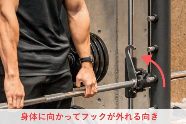 スミスマシンデッドリフトをおこなう場合は、フックを外す方向に合わせて立つ向きを決めるのがおすすめ。