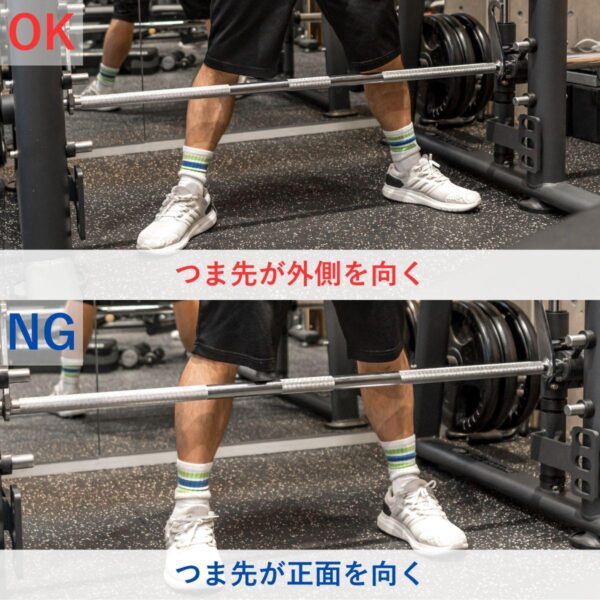 足幅を広く取り、つま先を外に開くことで内転筋に刺激が入ります。つま先が正面を向いたままだと、股関節がうまく外旋できず、ひざの軌道も不自然になってしまい関節にストレスがかかります。動作時はひざが内側に倒れないようにすることで、股関節を使った押し上げ動作がしやすくなります。