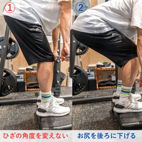 - 背中を真っすぐにした状態で、バーベルをひざの下まで落とす