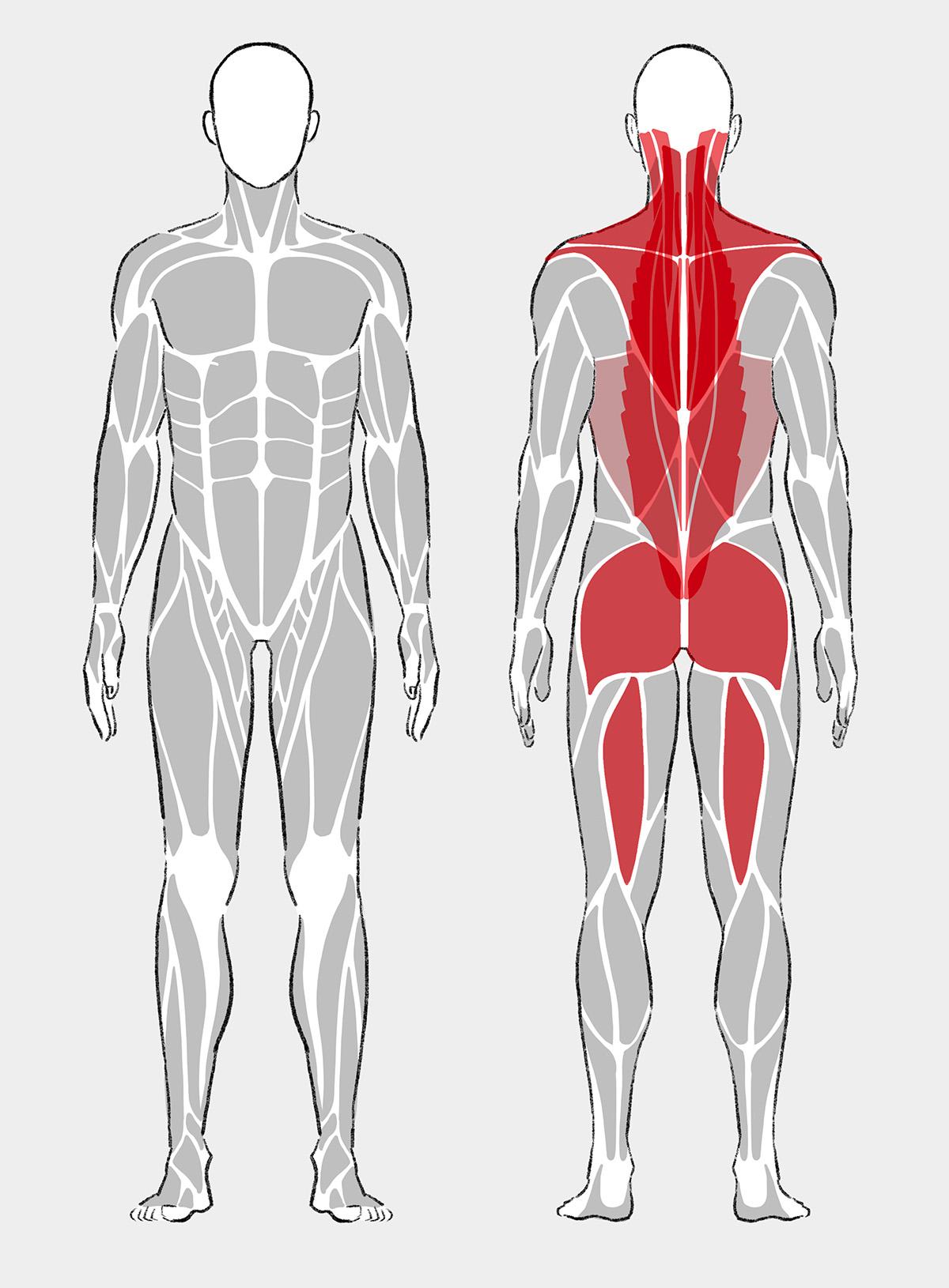 スミスマシンデッドリフトは、背中と下半身の筋肉をまとめて鍛えられる。なかでも脊柱起立筋、僧帽筋、広背筋、大殿筋、ハムストリングの動員が大きい。