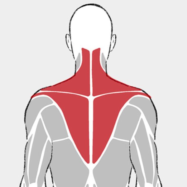首の後ろから肩、背中にかけて位置する。菱形状に広がり、上部・中部・下部の3つに分かれている。肩をすくめる・首を動かす・腕を引くなどの動作をサポートする。