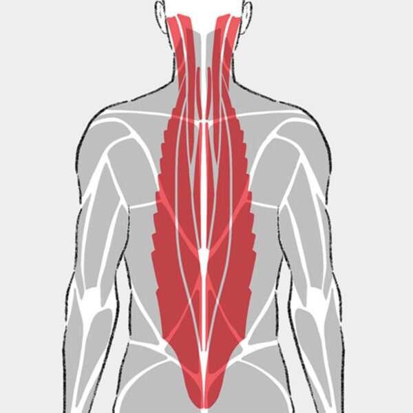 脊柱起立筋は背骨沿いに走る背筋群で、首から腰にかけて広がっている。姿勢を保つ、背骨を安定させる、体を反らすなどの働きに関与する。