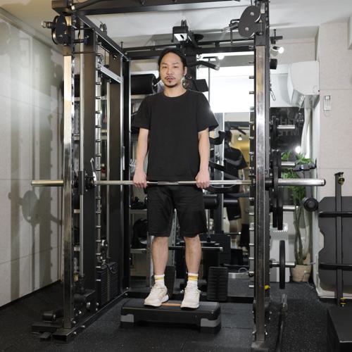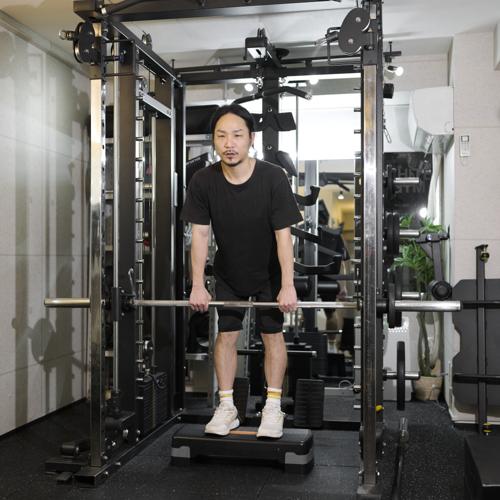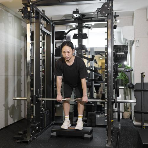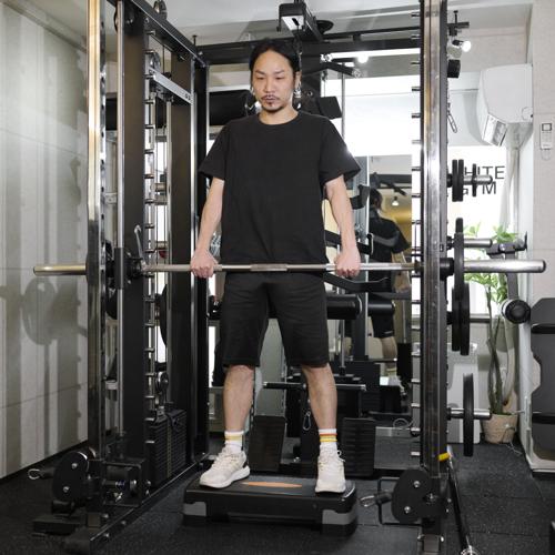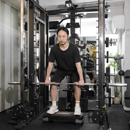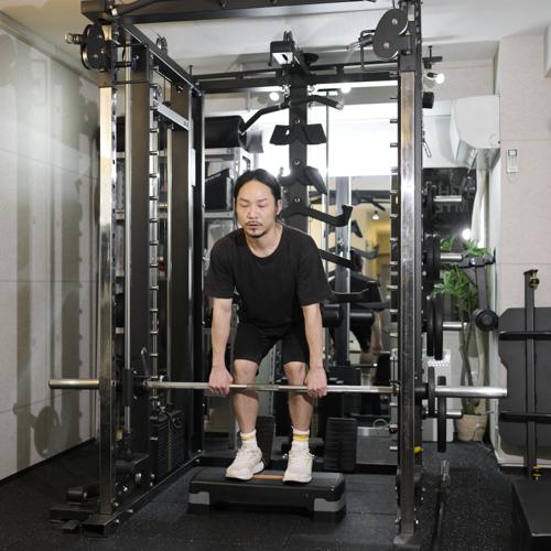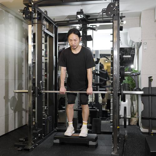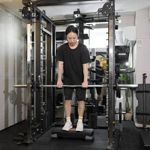 スミスマシンにはセーフティーストッパーがあるため、動ける可動域が狭くなりやすいのがデメリットです。可動域が狭いままだと、背筋に負荷が乗りにくくなります。そのため、ステップ台などに乗りバーを深く降ろせるやり方がおすすめです。