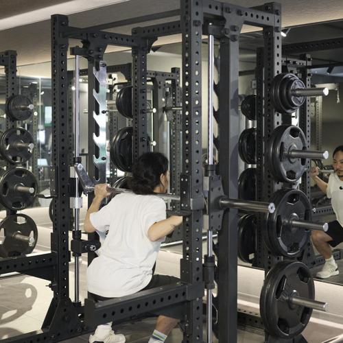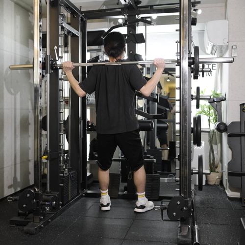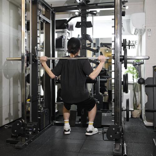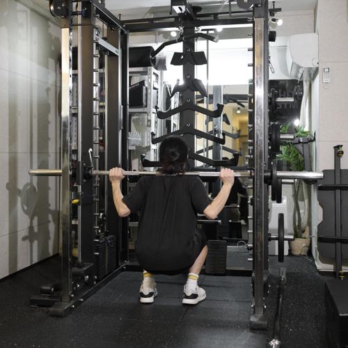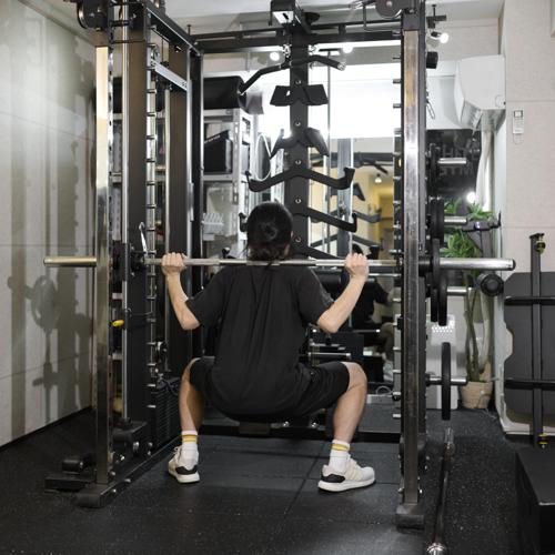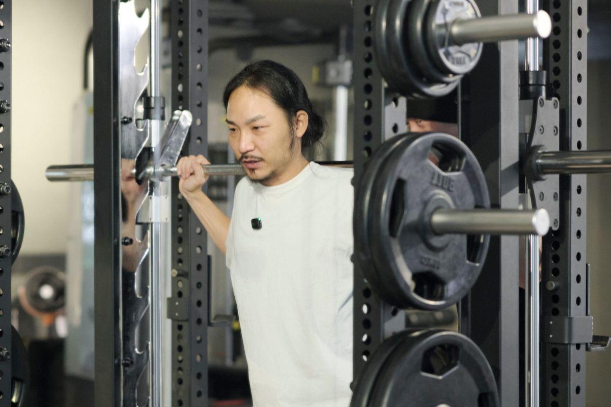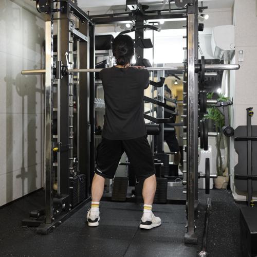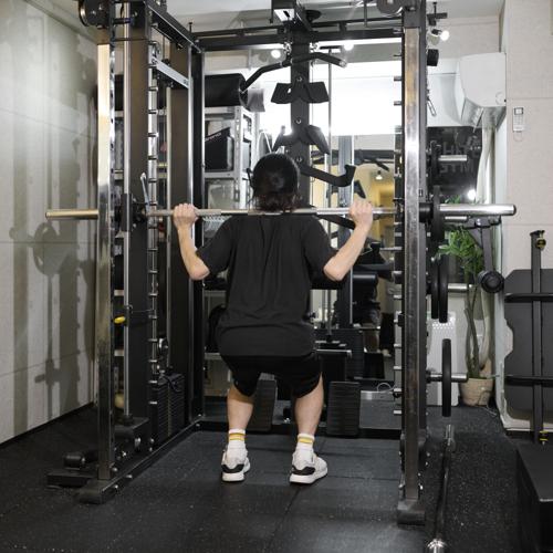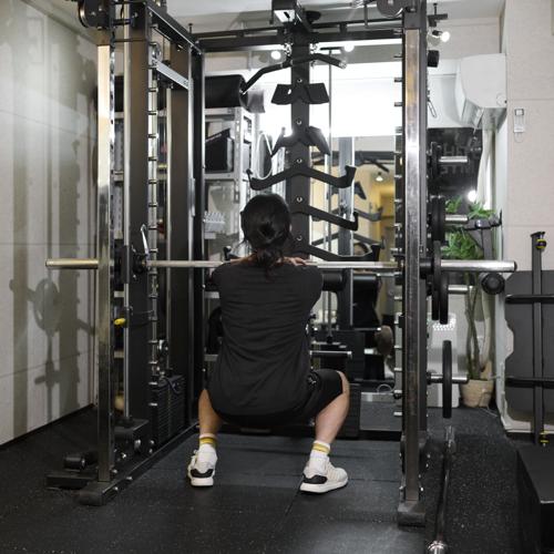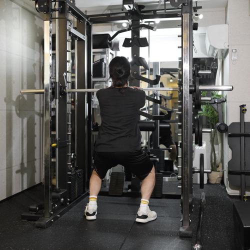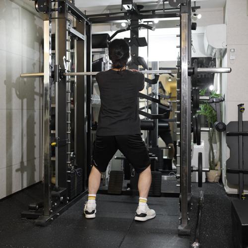 ▼普段の重量(60㎏)でスミスマシンスクワットをしている様子