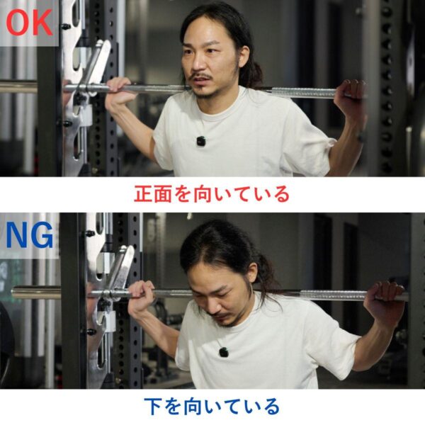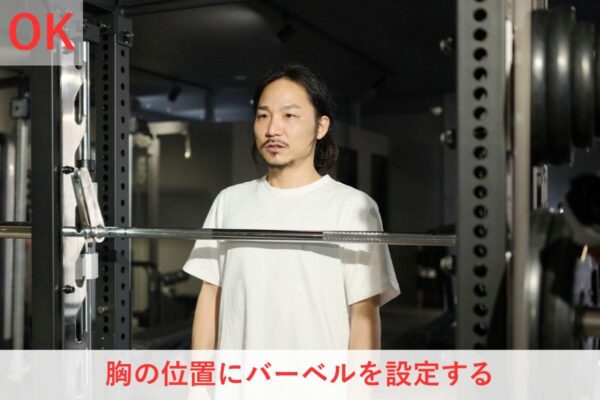 - バーベルをフックから外し、鎖骨付近に乗せる