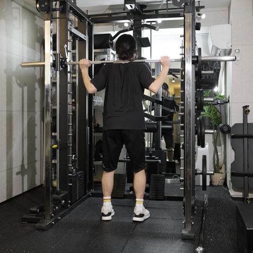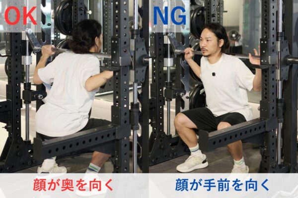 スミスマシンスクワットでは、顔が奥を向くように立つのが基本。ほとんどのジムでは、スミスマシンの奥に鏡を設置しているため、鏡で確認しながら正しいセットポジションをつくりやすい。