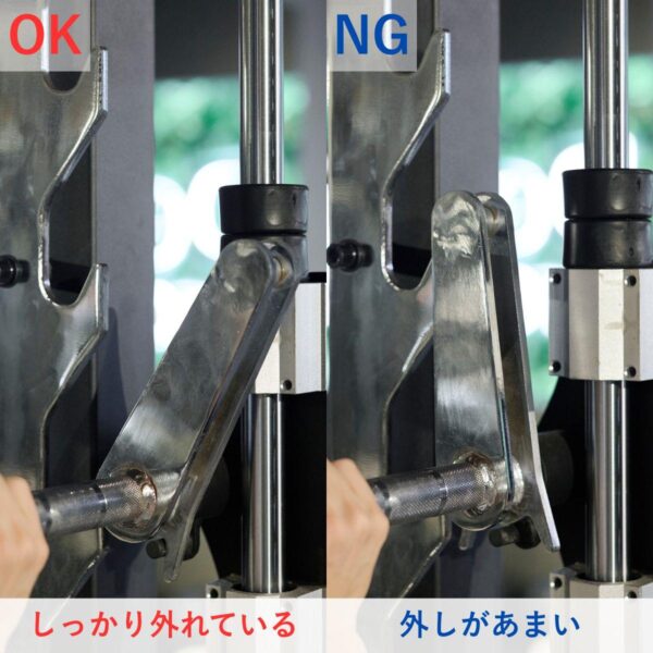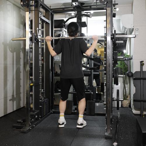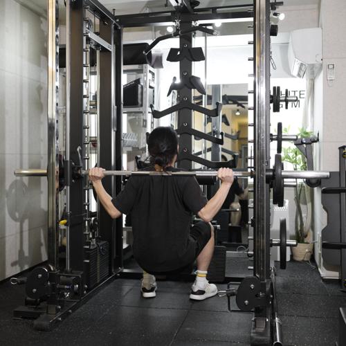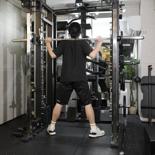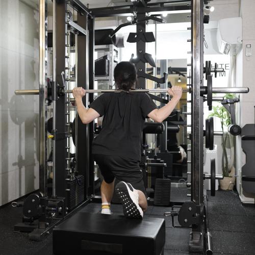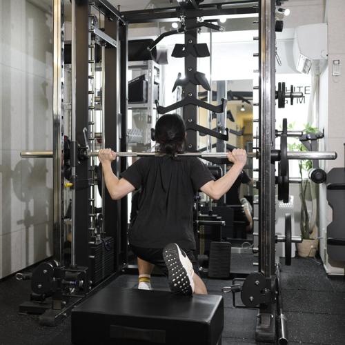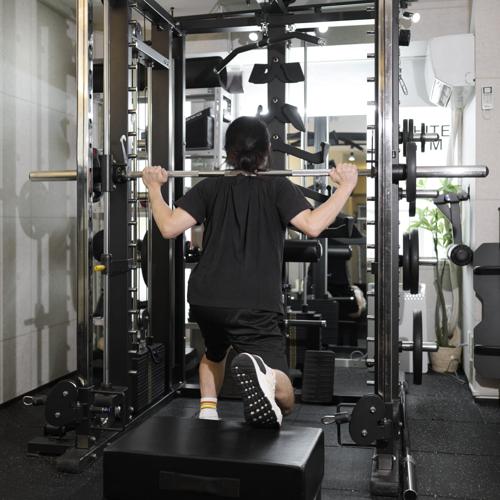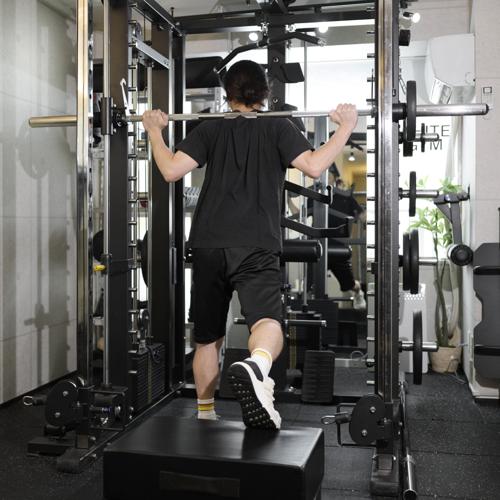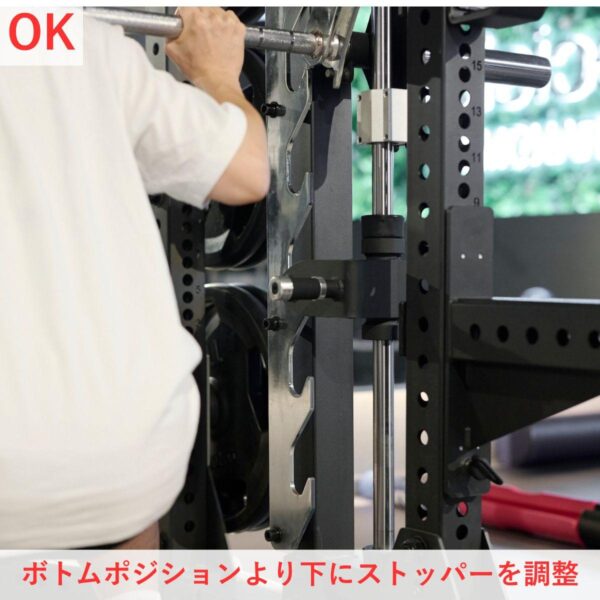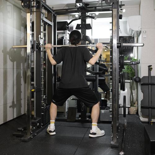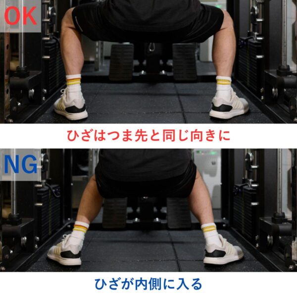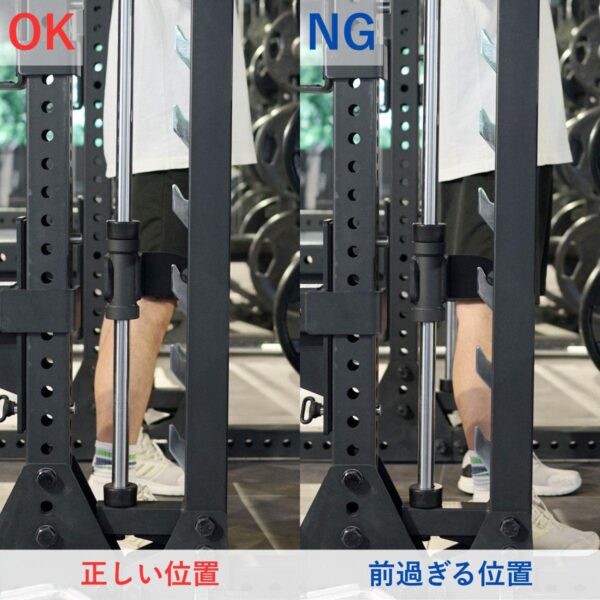 ひざや腰に痛みが出る場合、多くはフォームと立ち位置のズレが要因となるケースが多いでし。まずは足幅とつま先の方向を揃え、股関節を折りたたむ動作をていねいに行うことが必要です。スミスマシンは軌道が一定のため、立ち位置を微調整するだけで負担が大きく変わります。