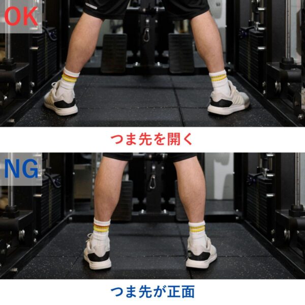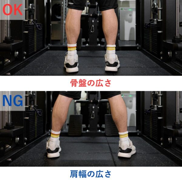 スミスマシンナロースクワットをおこなう際は、まずは足幅を適正に設定しフォームが安定する範囲で可動域を確保しましょう。