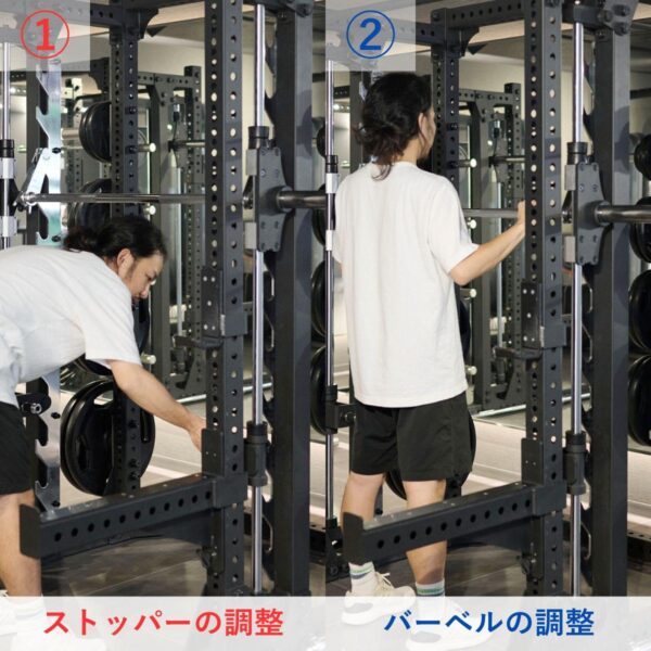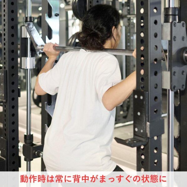- フックを外しバーベルをかつぎ、足を骨盤程度に開く