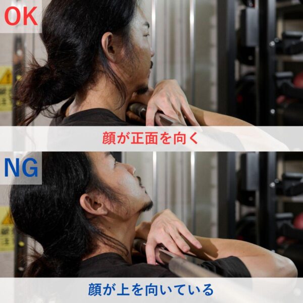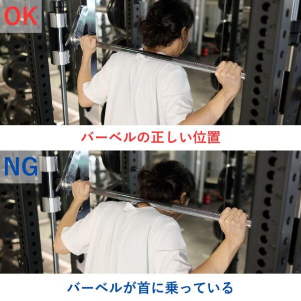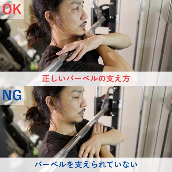 バーベルの乗せ方は、腕をクロスして支える方法が一般的です。また、腹圧を抜かないことも大切で、体幹の緊張が抜けると一気に姿勢が崩れます。