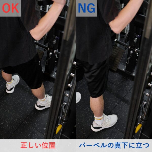 スミスマシンスクワットのセットアップでは、バーの軌道と足の位置関係をそろえることも非常に重要です。ひざや腰に無理な負担をかけないため、基本はバーの真下に両足がくる向きで立つことで、自然なしゃがみ込みがつくりやすくなります。