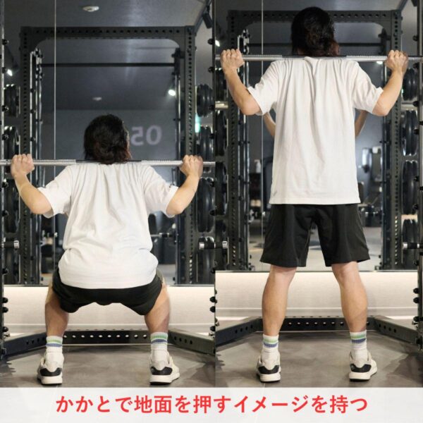 - 肩幅程度に足を開き、上体を起こしたまま腰を落とす