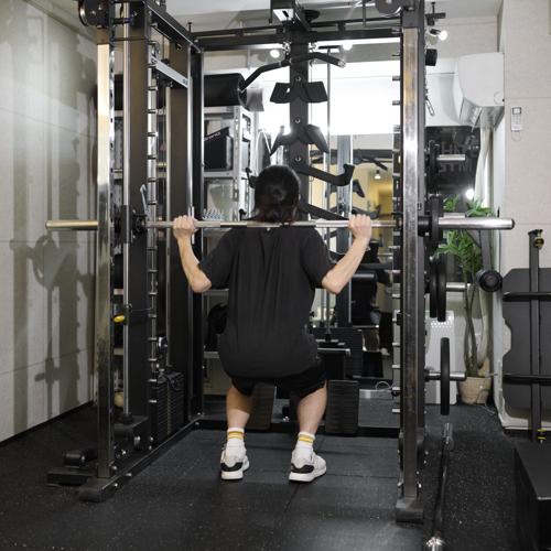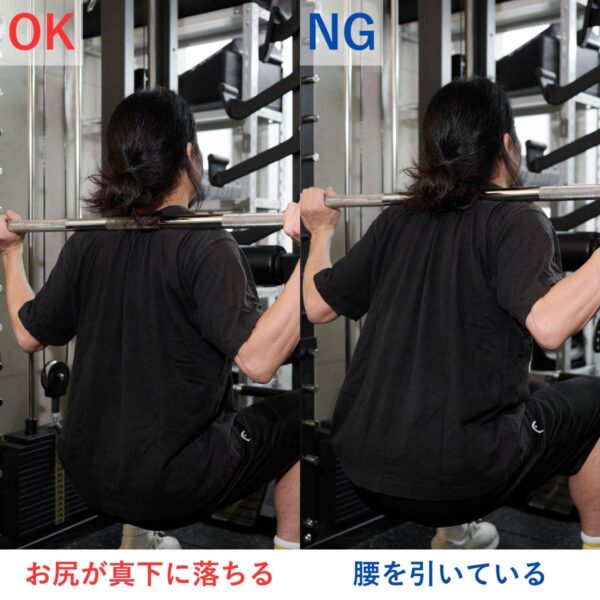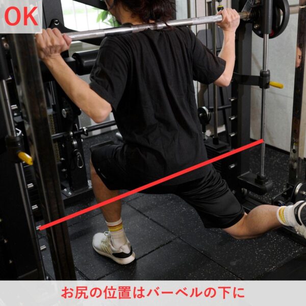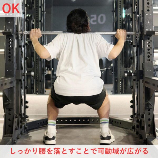スミスマシンは深くしゃがんでもフォームが崩れにくいため、筋肉がしっかり伸びる深さまで下げることがポイント。