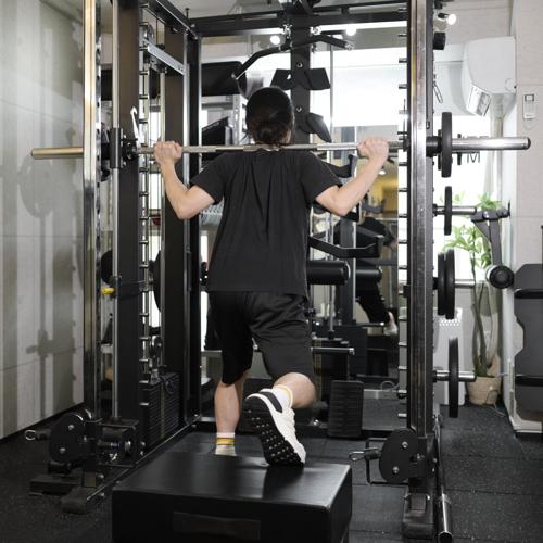 - フックを外しバーベルをかつぎ、片足を後ろの台に乗せる