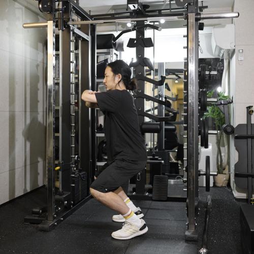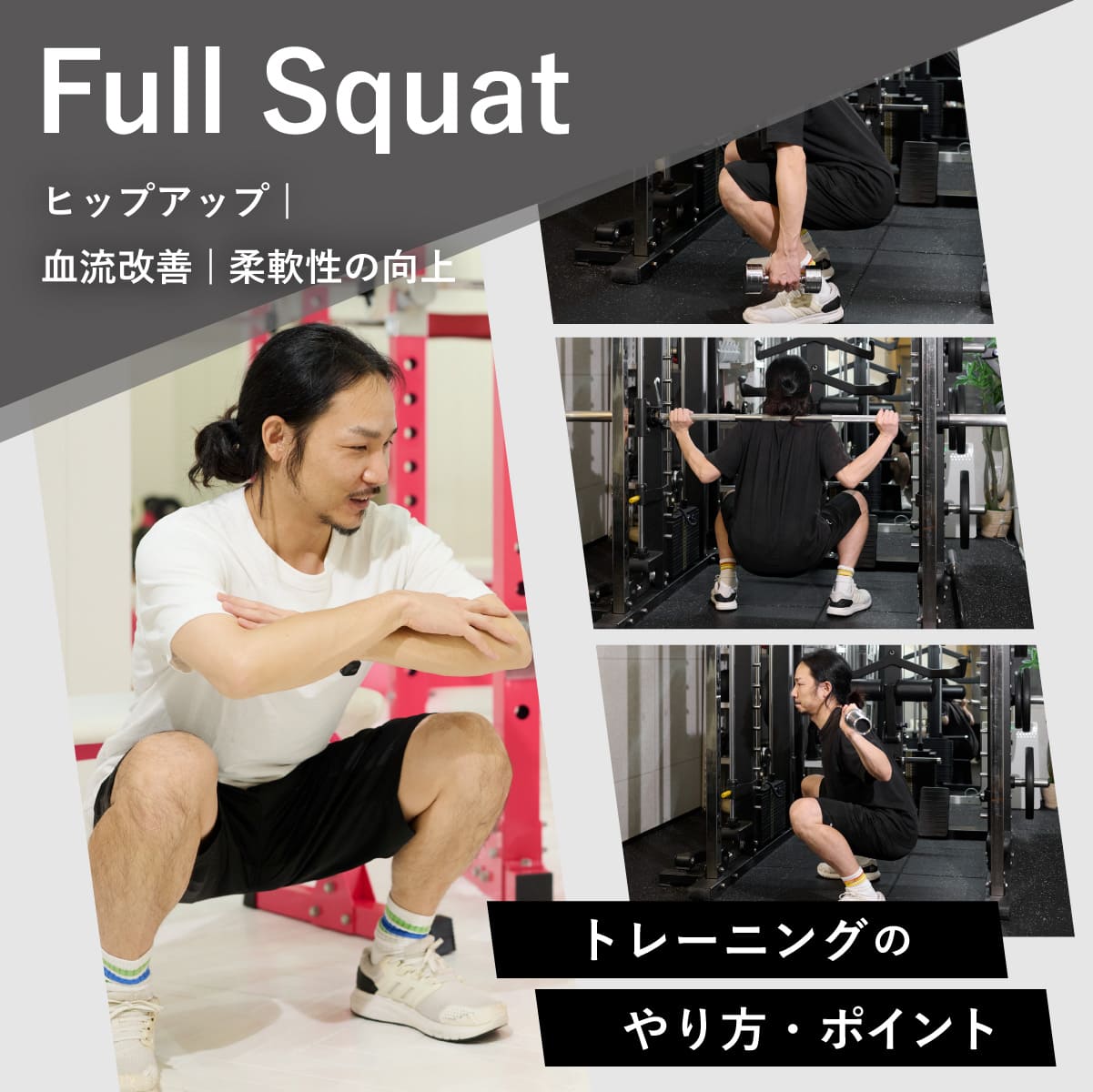 太ももが床と水平になる通常のスクワットより、さらに深くしゃがみ込むフルスクワット。下半身全体へ強いストレッチ刺激が入り、大腿四頭筋だけでなく大殿筋・ハムストリング・ふくらはぎまで効率的に鍛えられる。