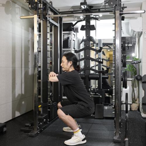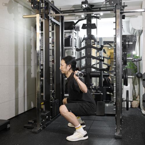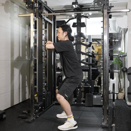 フルボトムスクワットで10回を安定してリフトアップできた重量は約50kgでした。パラレルスクワットと比べると、可動域が広がる分だけ負荷の体感が大きく、同じ重量では動作が雑になりやすい印象です。目安としては、パラレルスクワットの使用重量の7〜8割程度から始めると、フォームを保ったまましっかり追い込めそうだと感じました。