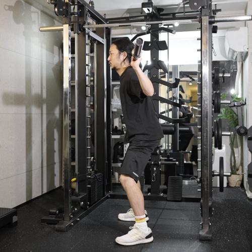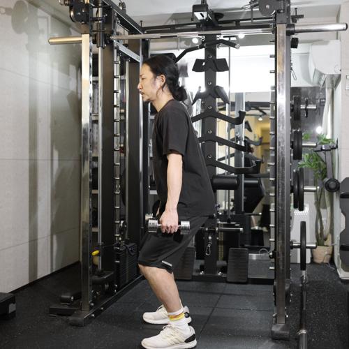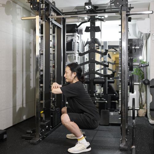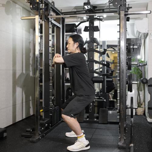 つま先立ちの状態をキープしたまましゃがむことで、足首やふくらはぎの柔軟性が低い人でも可動域が取りやすいと感じています。大腿前面に強い刺激が入り、通常のフルスクワットとは負荷のかかり方がはっきり違う印象でした。