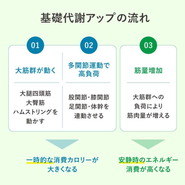 フルスクワットは全身の中でもエネルギー消費量が大きい下半身の筋肉を集中的に使うため、基礎代謝を底上げする効果が高い。特に大腿四頭筋や大臀筋といった大筋群が活発に働くことで、トレーニング後もエネルギー消費が持続する。