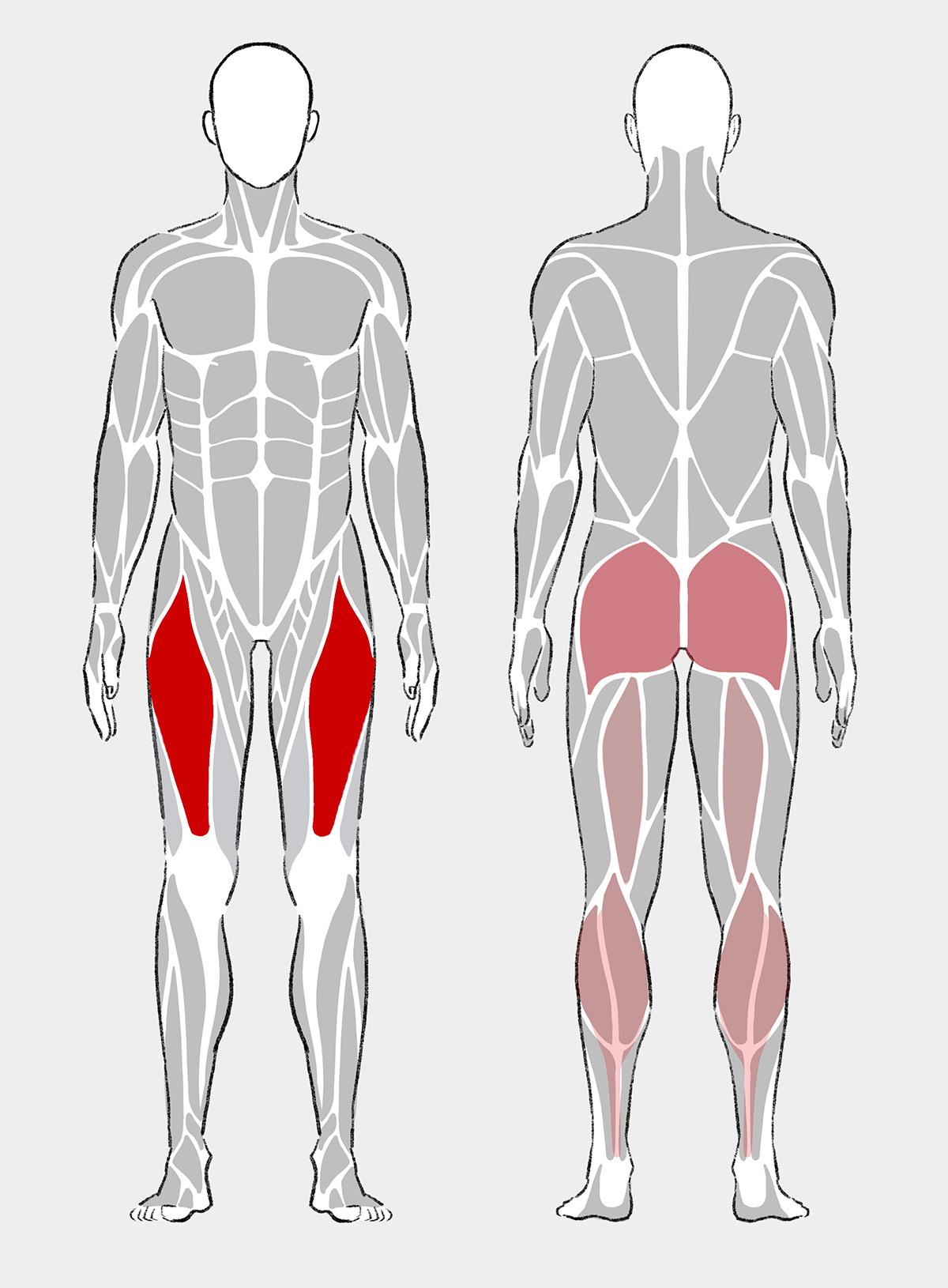 大腿四頭筋は太ももの前側に位置する。しゃがむ動作で強く働き、ひざを伸ばす瞬間に負荷が集中する。