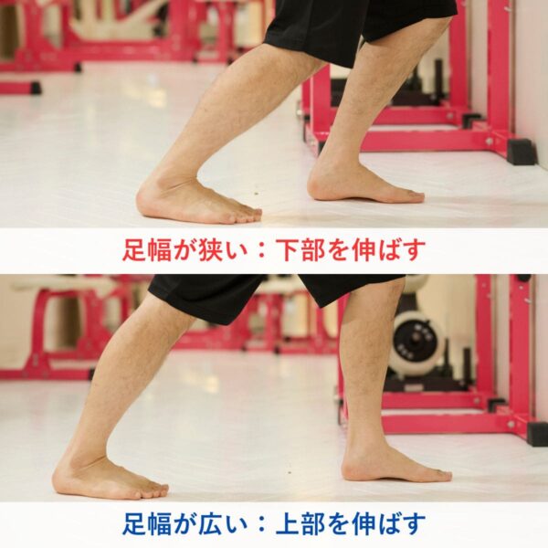 トレーニング前に股関節を動かす動的ストレッチ、ヒラメ筋下部を伸ばすストレッチがおすすめです。ヒラメ筋下部のストレッチは上部のストレッチと違い、足幅を狭くして伸ばすようにしましょう。