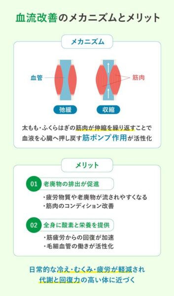 | 健康や体力 | 歩行・立位を支えて疲れにくさや全身の活動量向上に影響する。 |