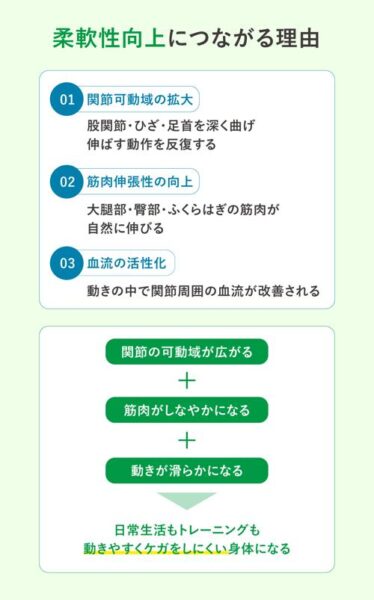 可動域を広げるには、トレーニング前のストレッチが欠かせない。特にふくらはぎ・ハムストリング・股関節まわりを重点的に伸ばすと、動作が安定しやすくなる。ストレッチは静的ではなく、動きを伴う「ダイナミックストレッチ」を選ぶと効果的。関節の動きをスムーズにすることで、フォームが整いやすくなり、深くしゃがむ動作が自然に行える。