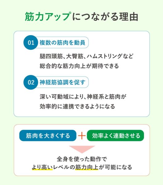 | 鍛えられる部位 | 大腿四頭筋、内転筋群、ハムストリング、大殿筋、ふくらはぎ |