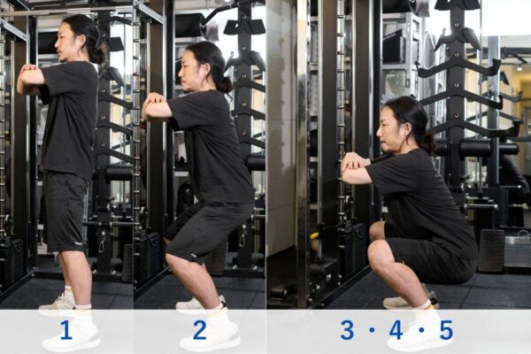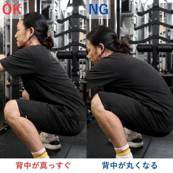 - 背中をまっすぐにしたまま、ゆっくり深く腰を落とす
