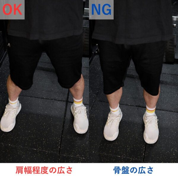 - 足を肩幅に開き、つま先を少し外へ向ける