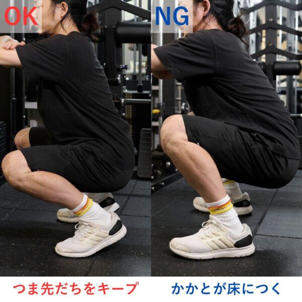 つま先立ちにすることで足首の角度が確保され、深くしゃがみやすくなる点が特徴です。ひざが自然につま先より前に出ますが、つま先立ちにすることで、ひざへの負担も軽減できます。