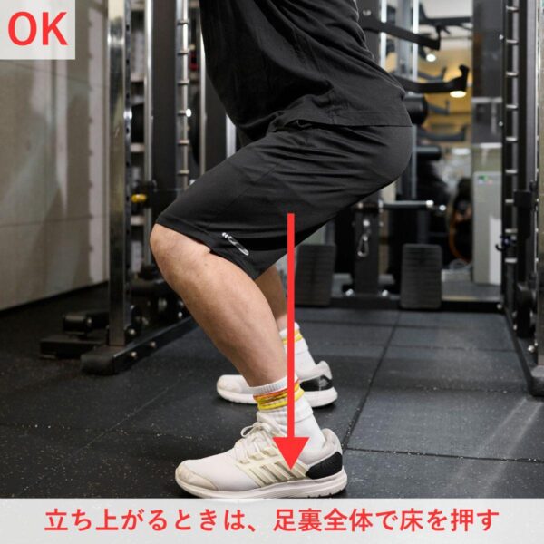 背中をまっすぐ保ったまま深く腰を落とすことで、大殿筋にもしっかり負荷が入ります。また、疲労が溜まるにつれて、ひざが内側に入りやすくなるため注意した方がよさそうです。