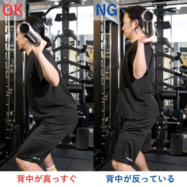 - バーベルを担ぎ、肩甲骨を寄せて背中をまっすぐに保つ