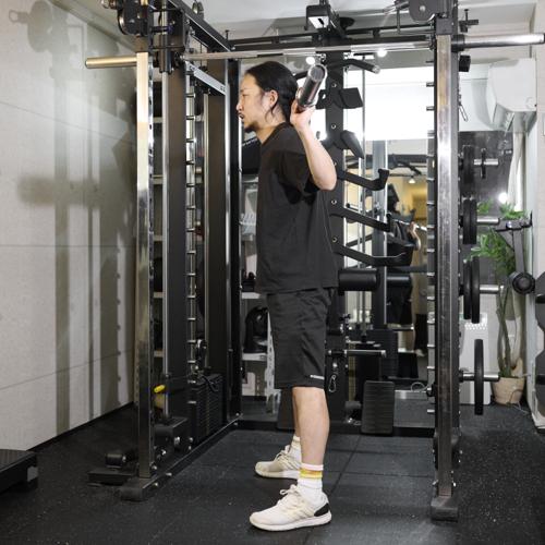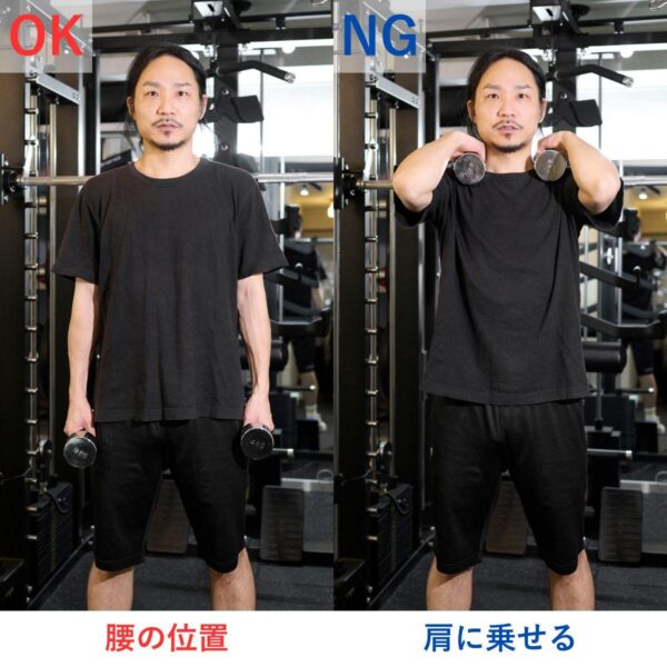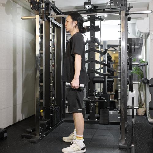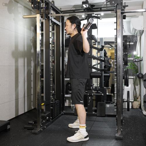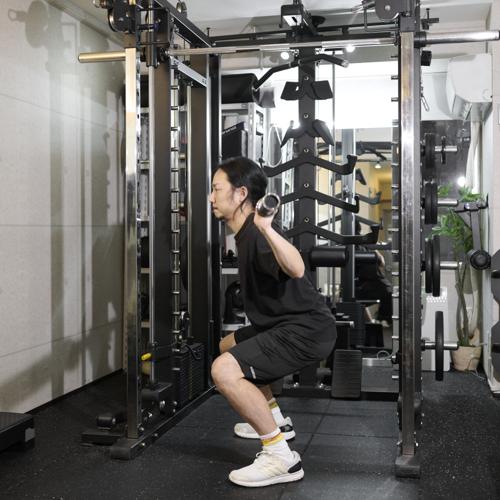検証者の場合はダンベルを肩に乗せた方が重心が安定しやすくフォームを崩しにくいと感じました。バーベルよりも重量を細かく調整できるため、重量をあげる段階のステップとして取り入れるのがおすすめです。