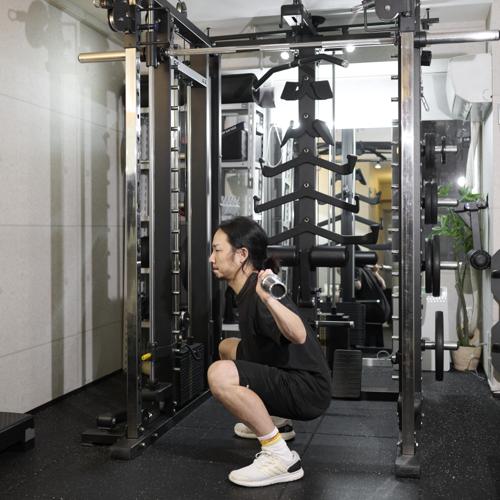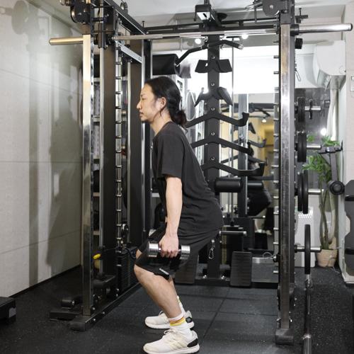 胸の前に抱える方法も踏まえて、ダンベルの持ち方を工夫することで安定感を保つことができます。また、足幅を微調整しながら、自分なりの深く・安全にしゃがめるフォームを見つめ直す方法もおすすめ。