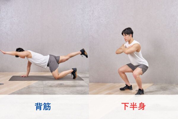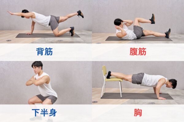 メニュー構成の考え方としては、部位別に分ける方法よりも全身をバランスよく鍛える組み方がおすすめ。背筋、腹筋、下半身、胸、肩など、各部位から1種目ずつ選び、毎回全身を動かすことを意識しよう。