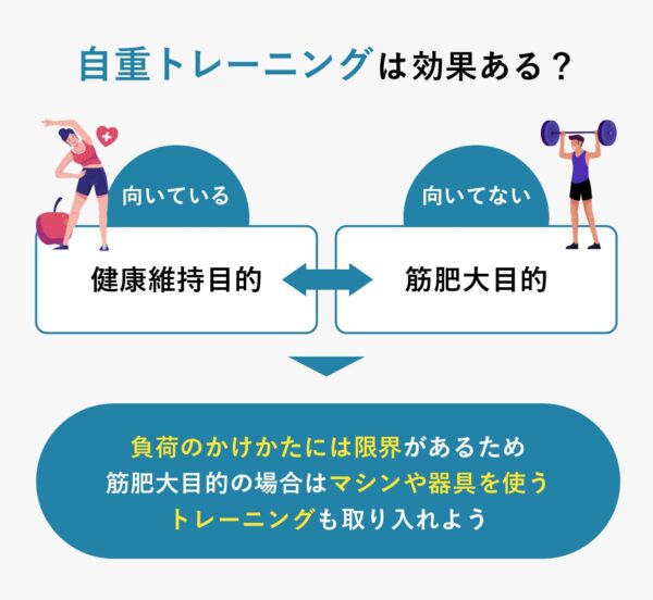 器具なしで始められどこでもおこなえる自重トレーニング。目的と負荷設定を工夫すれば筋力アップや引き締めに十分効果が期待できる一方で、筋肥大を本格的に狙う場合は負荷が頭打ちになりやすい。