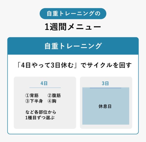 おすすめは、4日間しっかりトレーニングをおこない、その後2〜3日間休むサイクル。連続して筋トレした後にまとめて休むことで、メリハリがあって継続しやすい習慣になる。